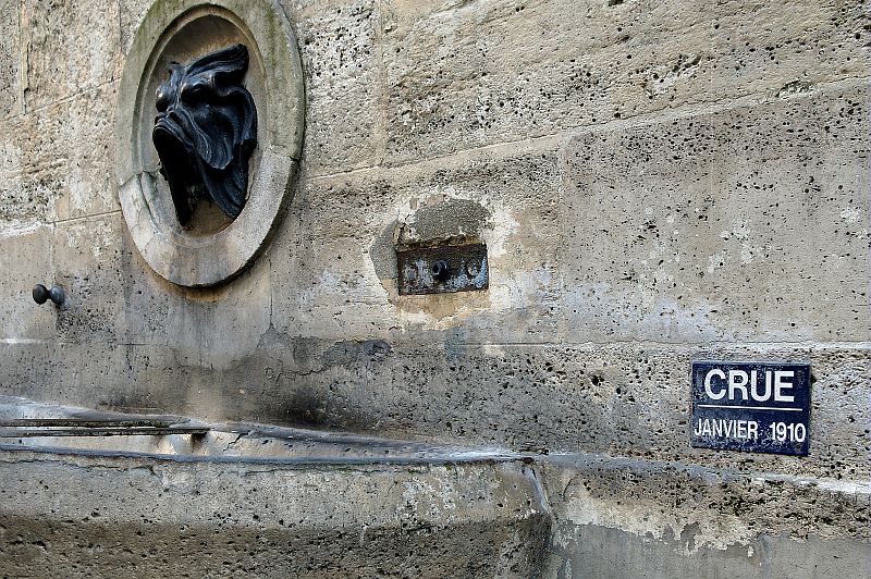 Fontaine publique et repère de crue à Paris dans le 7e arrondissement © L. Mignaux - Terra