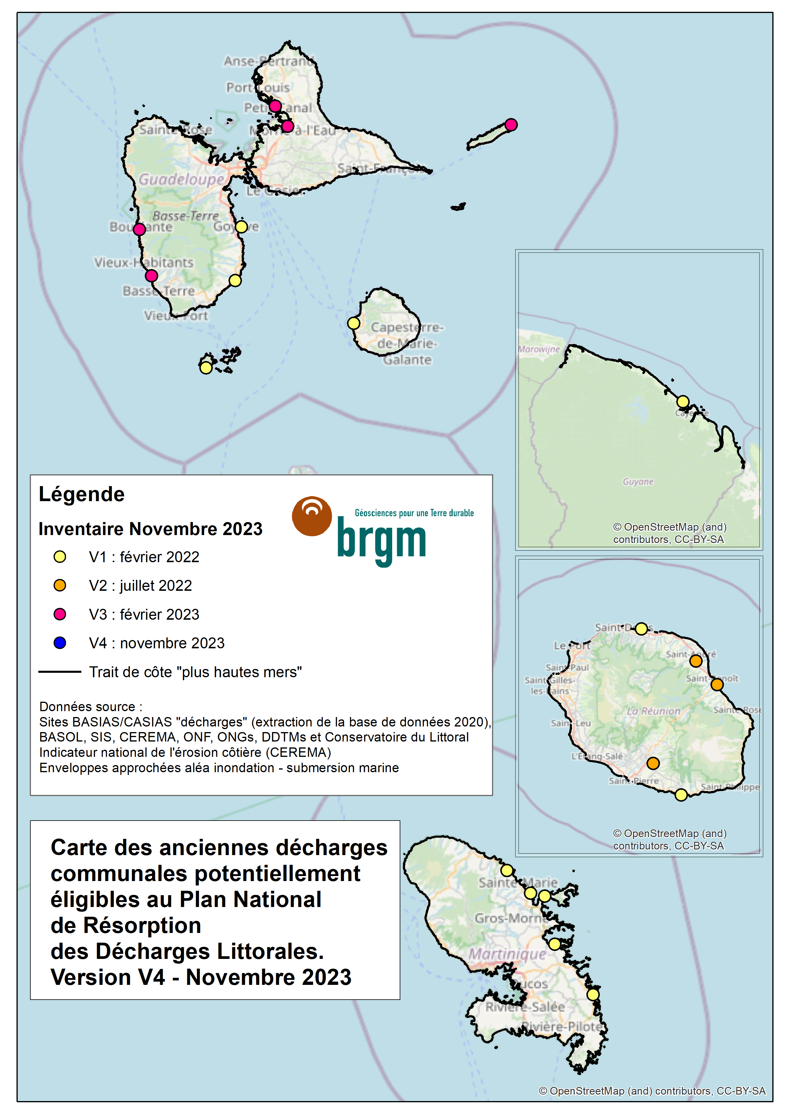 NOTA : dans les DROMs, les anciennes décharges situées à proximité de ravines ont également été prises en compte dans la V2 de l’inventaire.