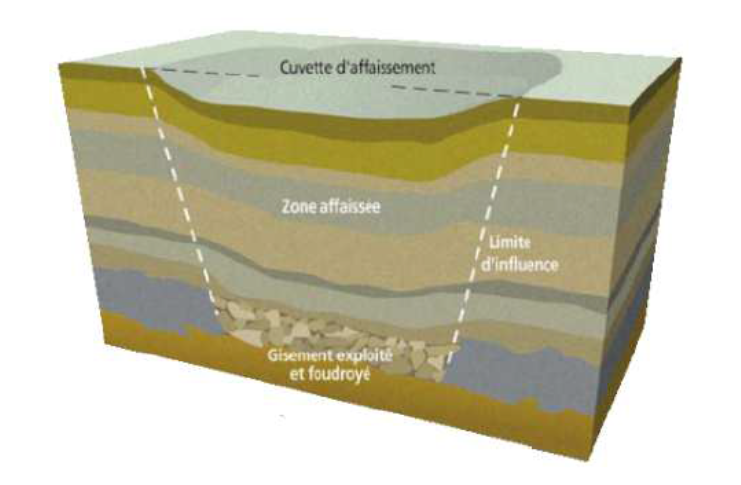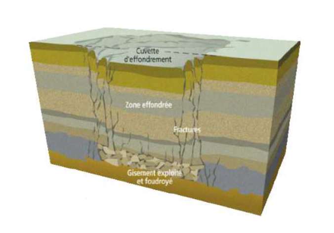 Il s’agit d’un mouvement de terrain brutal, et extrêmement rapide, qui est lié à la présence de grandes zones exploitées et non remblayées à faible profondeur qui forment désormais un vide. Sous le poids des terrains situés au-dessus, la zone s’effondre brutalement de plusieurs mètres sur un périmètre très importantes (dimensions supérieures à 100 mètres). Ce type de phénomène demeure rare.