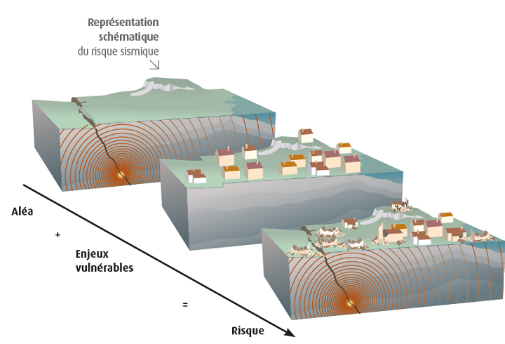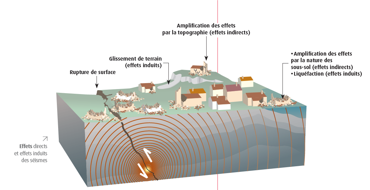 Les séismes peuvent avoir des conséquences sur la vie humaine, l'économie et l'environnement. Le séisme est le risque naturel majeur le plus meurtrier, tant par ses effets directs (chutes d'objets, effondrements de bâtiments) que par les phénomènes induits (mouvements de terrain, tsunamis, etc.). En outre, ces phénomènes peuvent conduire à la rupture de réseaux de gaz, source d’incendies ou d’explosions, provoquant un nombre important de victimes indirectes. Outre les victimes possibles, un très grand nombre de personnes peuvent se retrouver, suite à un séisme, sans abri et déplacées. Un séisme et ses éventuels phénomènes induits peuvent engendrer la destruction ou l'endommagementMesure d'un dommage sur un bien ou une activité. des habitations, des outils de production (usines, bâtiments des entreprises, etc.), des ouvrages (ponts, routes, voies ferrées, etc.), des réseaux d’eau, d’énergie ou de télécommunications, causant des pertes matérielles directes et des perturbations importantes de l’activité économique.
