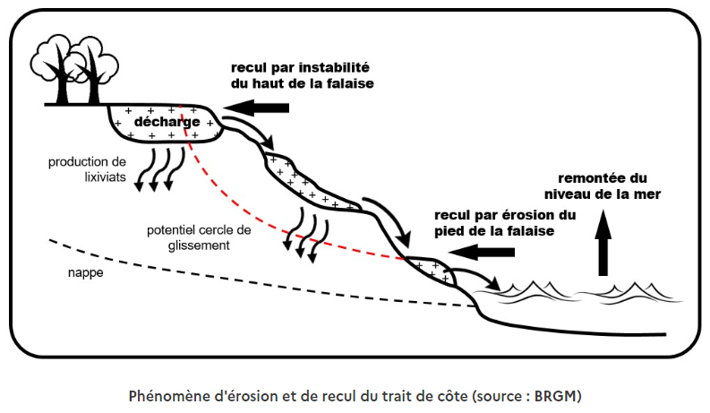 La présence sur le littoralLe littoral est la bande de terre constituant la zone comprise entre une étendue maritime et la terre ferme, le continen... français d’anciennes décharges en frontterme désignant l'avant (partie frontale) d'une coulée ou d'un écoulement (ex: lahar) de mer constitue une menace environnementale majeure. En effet, des déchets sont susceptibles de se retrouver sur les plages et/ou en mer du fait de l’érosion du trait de côte ou de phénomènes de submersion marine. Ces phénomènes pourraient s’accentuer ces prochaines années en raison du changement climatique, qui entraîne une élévation du niveau des mers et augmente les risques d’érosion côtière et de submersion. Face à ce constat, le président de la République, Emmanuel Macron, a pris l’engagement lors du One Ocean Summit, en février 2022, de résorber sur dix ans les décharges littorales historiques, présentant à court terme le plus fort risqueProbabilité qu'un effet spécifique se produise dans une période donnée ou dans des circonstances déterminées. En conséqu... de relargage déchets en mer, prolongeant ainsi les actions prises dans la Feuille de route « Zéro déchet plastique en mer 2019-2025 ».