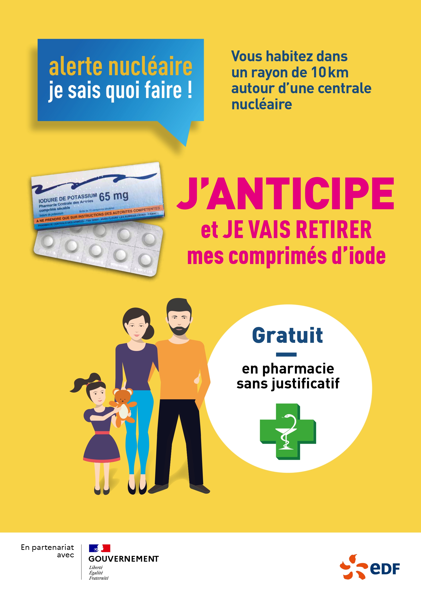 Les personnes résidantes dans la zone des PPI des installations civiles suivantes : CEA de Cadarache, Institut Laue Langevin de Grenoble et les 18 CNPE d’EDF (limité au rayon des 10 kms) sont invitées à retirer leurs comprimés d’iode dans l’une des pharmacies d’officine partenaires.
