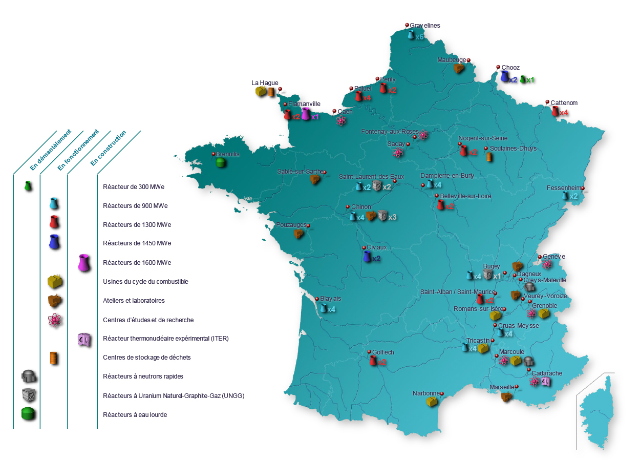 La France compte 56 réacteurs électronucléaires, répartis en 18 sites de production, tous situés en métropole. On y trouve aussi des centres de recherche (réacteurs expérimentaux, accélérateurs de particules, etc.), des usines de fabrication et de retraitement du combustible nucléaire, ainsi que des centres de stockage de déchets radioactifs. Au total, 124 installations nucléaires de base (INBInstallation nucléaire de base. Installation soumises, de par sa nature, ou en raison de la quantité ou de l'activité de...) étaient répertoriées à fin mai 2022, hors installations relevant de la défense.